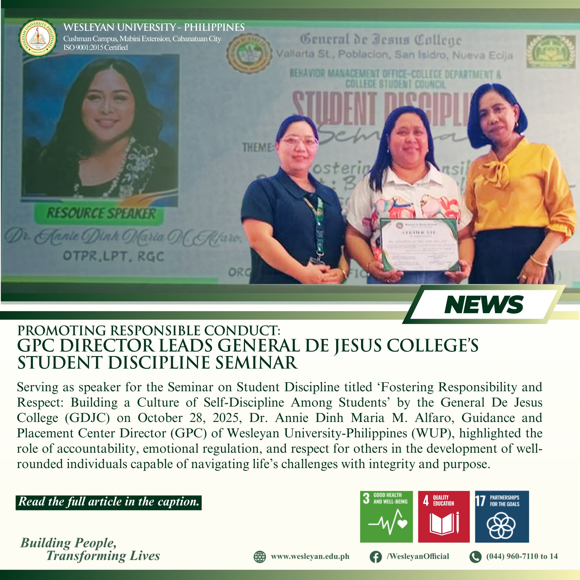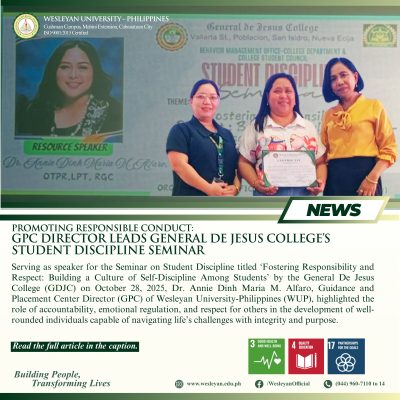 Serving as speaker for the Seminar on Student Discipline titled ‘Fostering Responsibility and Respect: Building a Culture of Self-Discipline Among Students’ by the General De Jesus College (GDJC) on October 28, 2025, Dr. Annie Dinh Maria M. Alfaro, Guidance and Placement Center Director (GPC) of Wesleyan University-Philippines (WUP), highlighted the role of accountability, emotional regulation, and respect for others in the development of well-rounded individuals capable of navigating life’s challenges with integrity and purpose.