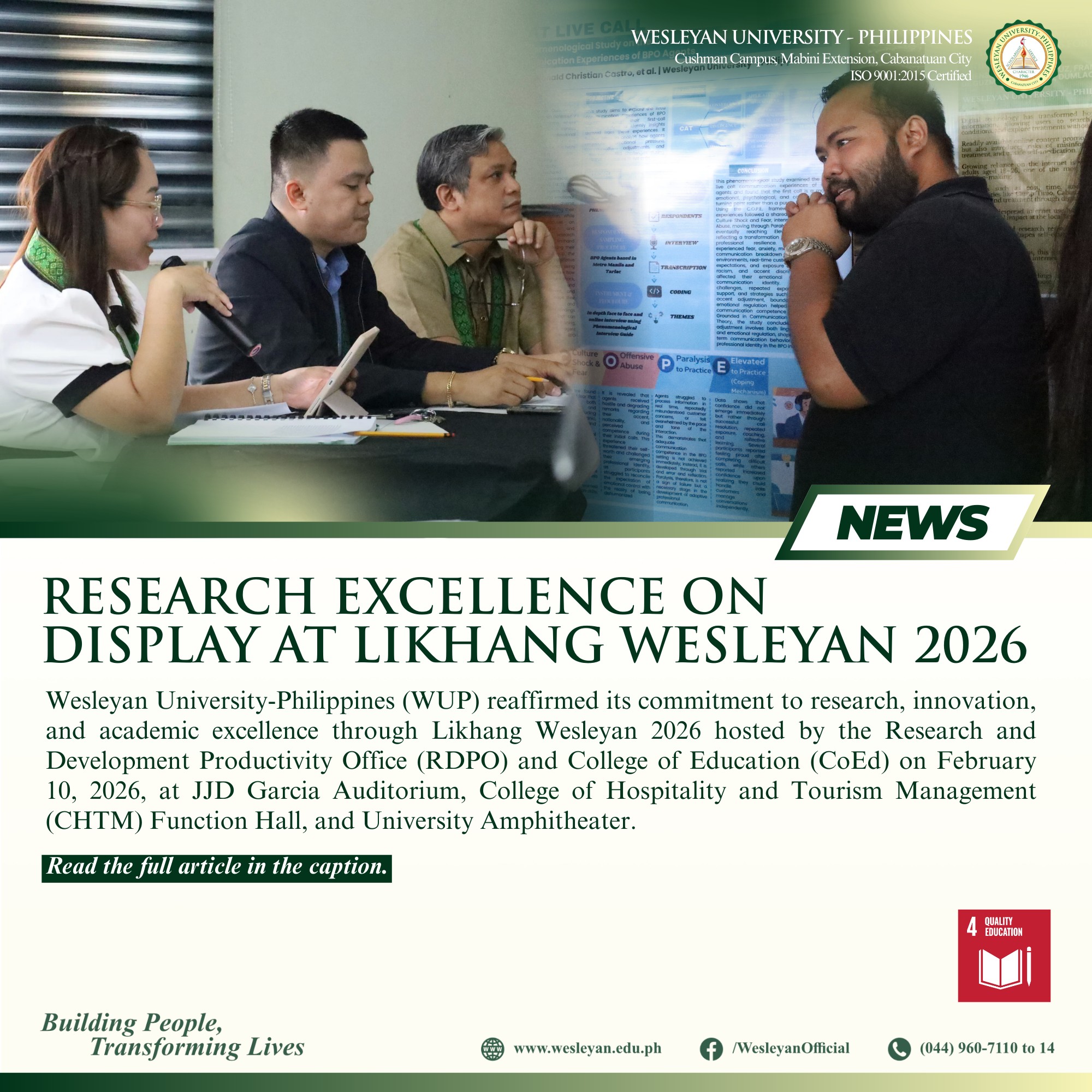 Wesleyan University-Philippines (WU-P) reaffirmed its commitment to research, innovation, and academic excellence through Likhang Wesleyan 2026 hosted by the Research and Development Productivity Office (RDPO) and College of Education (CoEd) on February 10, 2026, at JJD Garcia Auditorium, College of Hospitality and Tourism Management (CHTM) Function Hall, and University Amphitheater.