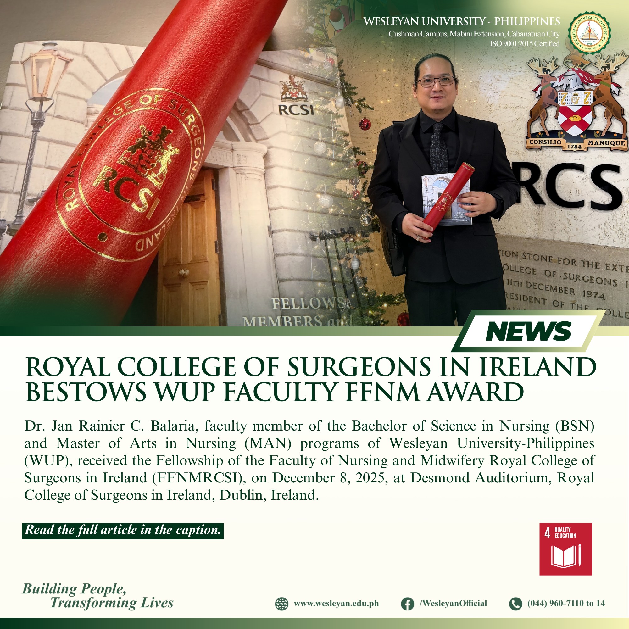Dr. Jan Rainier C. Balaria, faculty member of the Bachelor of Science in Nursing (BSN) and Master of Arts in Nursing (MAN) programs of Wesleyan University-Philippines (WUP), received the Fellowship of the Faculty of Nursing and Midwifery Royal College of Surgeons in Ireland (FFNMRCSI), on December 8, 2025, at Desmond Auditorium, Royal College of Surgeons in Ireland, Dublin, Ireland.The FFNMRCSI, based on the document shared by Dr. Carissa Juliana Balaria, College of Nursing Dean, to the Public Information Office, is granted by RCSI University of Medicine and Health Sciences to select nurses and midwives who have shown exceptional leadership, made remarkable contributions to their field, and demonstrated meaningful impact on healthcare and society.