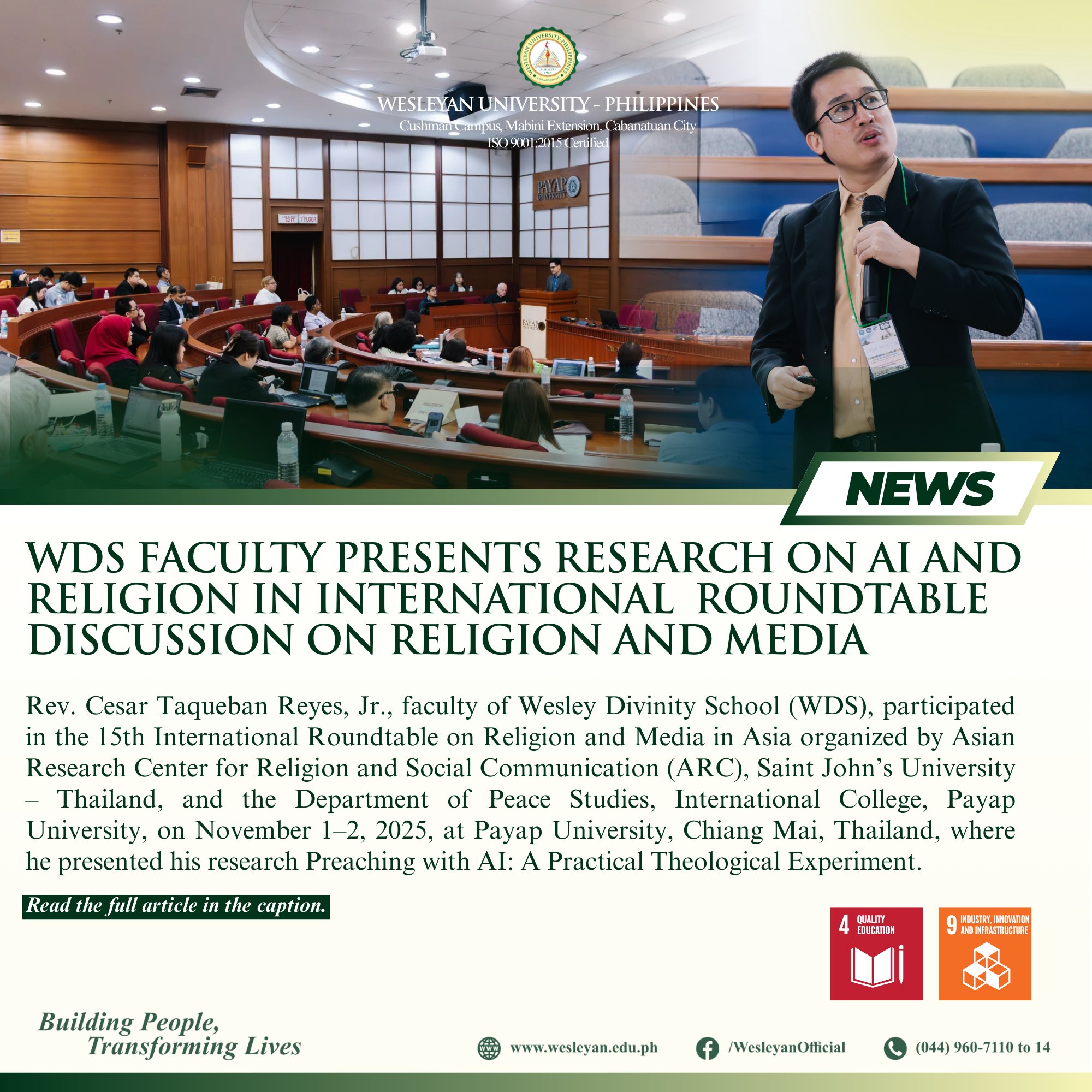 Rev. Cesar Taqueban Reyes, Jr., faculty of Wesley Divinity School (WDS), participated in the 15th International Roundtable on Religion and Media in Asia organized by Asian Research Center for Religion and Social Communication (ARC), Saint John’s University – Thailand, and the Department of Peace Studies, International College, Payap University, on November 1–2, 2025, at Payap University, Chiang Mai, Thailand, where he presented his research Preaching with AI: A Practical Theological Experiment.