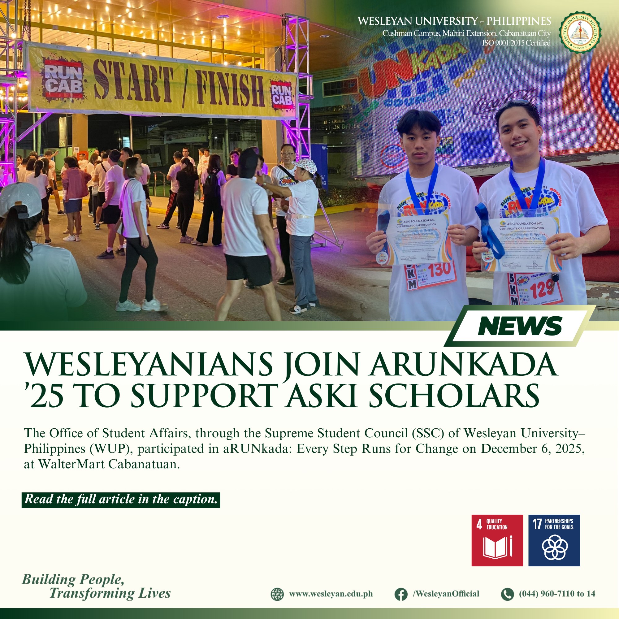 The Office of Student Affairs, through the Supreme Student Council (SSC) of Wesleyan University–Philippines (WUP), participated in aRUNkada: Every Step Runs for Change on December 6, 2025, at WalterMart Cabanatuan.The fun run was organized to raise support for the scholars of Alalay sa Kaunlaran, Inc. (ASKI) and gathered runners from various groups and partner organizations.