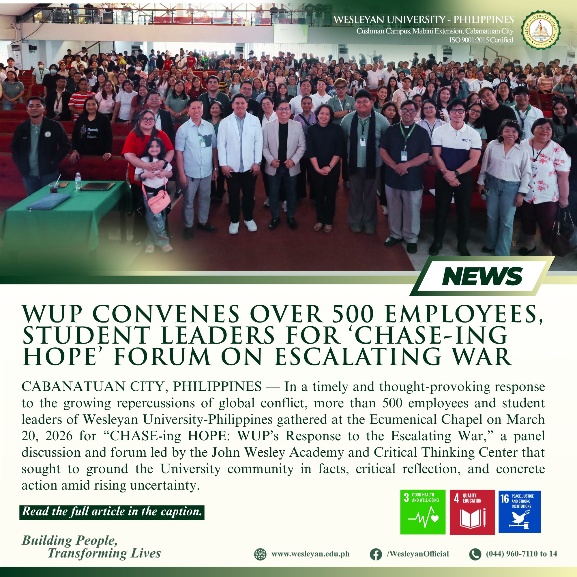 CABANATUAN CITY, PHILIPPINES — In a timely and thought-provoking response to the growing repercussions of global conflict, more than 500 employees and student leaders of Wesleyan University-Philippines gathered at the Ecumenical Chapel on March 20, 2026 for “CHASE-ing HOPE: WUP’s Response to the Escalating War,” a panel discussion and forum led by the John Wesley Academy and Critical Thinking Center that sought to ground the University community in facts, critical reflection, and concrete action amid rising uncertainty.Hosted by Gladys P. Mangiduyos, the forum opened with a rationale that emphasized how war does not remain confined to battlefields, but reaches nations, communities, institutions, and homes through rising fuel prices, increasing transportation costs, higher prices of basic commodities, disrupted food supply chains, and growing uncertainty in social and economic life. Anchored on the University’s core values of Compassion, Harmony, Accountability, Spirituality, and Excellence, Mangiduyos underscored that the gathering aimed to move the conversation from anxiety to action by identifying grounded, practical, and compassionate responses in the face of crisis. She also stressed that WUP is called not only to inform minds, but also to shape character grounded in reason, clarity, peace, resilience, and justice.