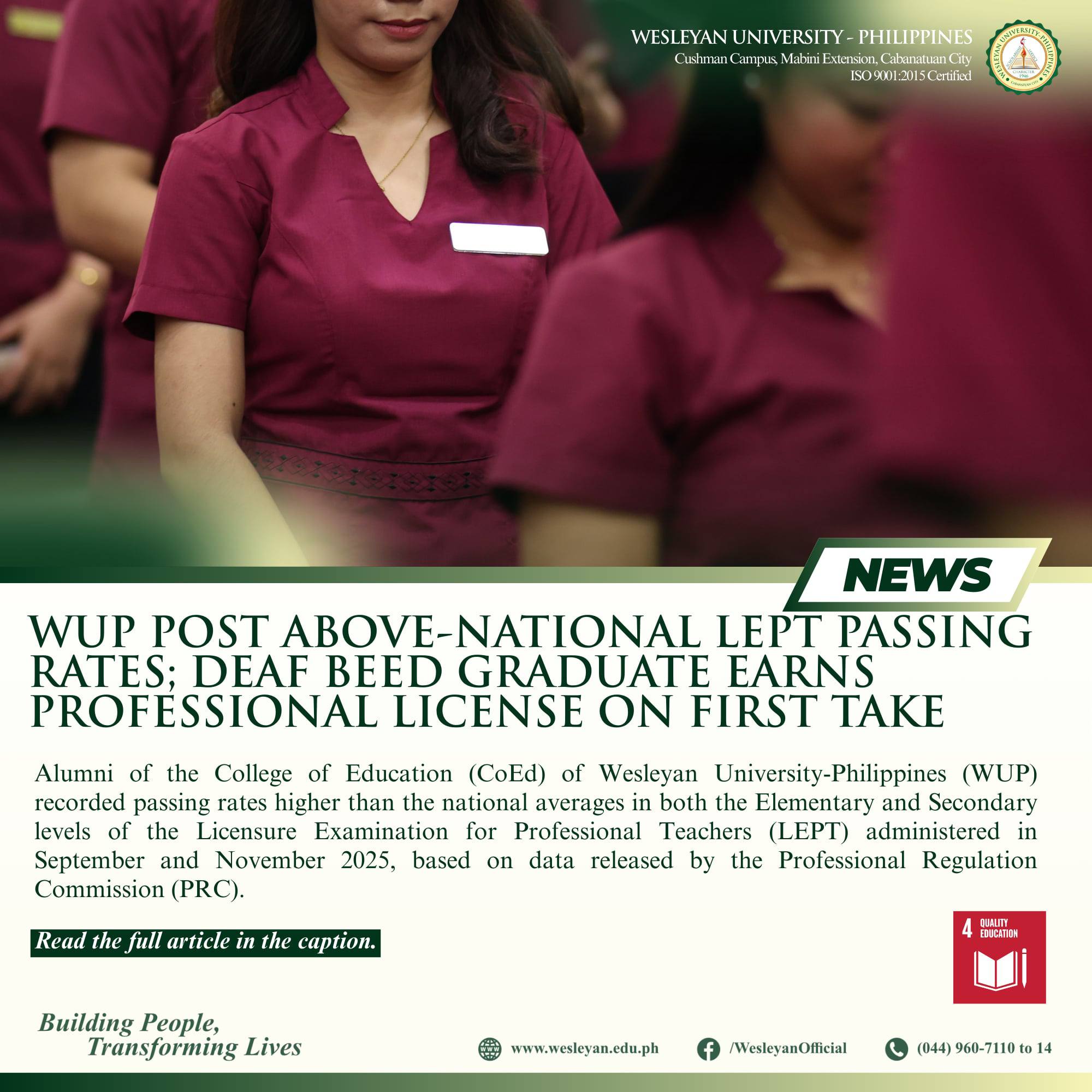 Alumni of the College of Education (CoEd) of Wesleyan University-Philippines (WUP) recorded passing rates higher than the national averages in both the Elementary and Secondary levels of the Licensure Examination for Professional Teachers (LEPT) administered in September and November 2025, based on data released by the Professional Regulation Commission (PRC).