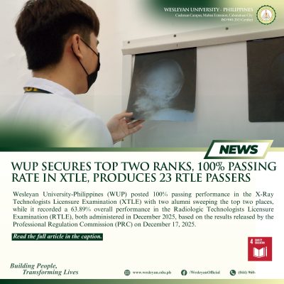 Wesleyan University-Philippines (WUP) posted 100% passing performance in the X-Ray Technologists Licensure Examination (XTLE) with two alumni sweeping the top two places, while it recorded a 63.89% overall performance in the Radiologic Technologists Licensure Examination (RTLE), both administered in December 2025, based on the results released by the Professional Regulation Commission (PRC) on December 17, 2025.